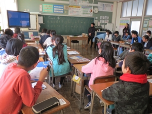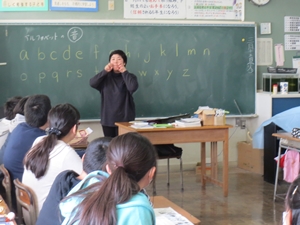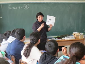 2016年3月15日 15時00分 3月15日(火)、今年度3回目となる、6年生を対象にした、稲田中学校英語科教諭による乗り入れ授業が行われました。1回目、2回目とアルファベットの読み書き練習を行ってきた子どもたち。最後は、アルファベットの「音」について学習しました。英語(アルファベット)には、日本語にない音があり、発音するのに少々難しいものもありましたが、中学校の先生の口の形や音の出し方を真似して、がんばって声に出していました。
