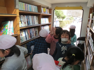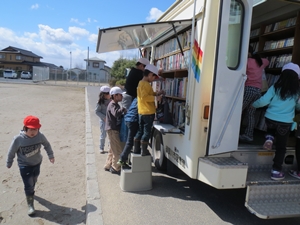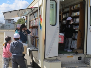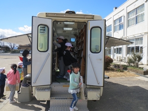 2016年3月16日 12時00分 3月15日(火)、今年度最後の移動図書館「うつみね号」が来校しました。「うつみね号」にかけよってくる子どもたちが多く、本を借りるのを本当に楽しみにしているんだなと感じました。春休みを利用して、さらに読書に親しんでほしいと思います。