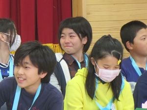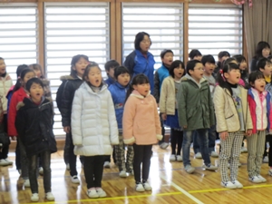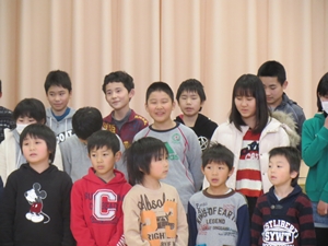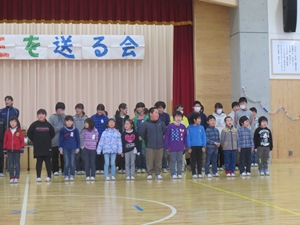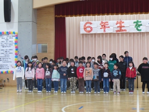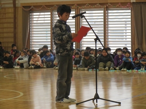 「6年生のみなさんには、掃除や登校班のときなど、さまざまな場面でお世話になりました。4月からは中学生ですね。勉強も難しくなり、部活動も始まりますが、がんばって楽しい中学校生活を送ってください。ときどき、小学校に来て、元気な姿を見せてください。ぼくたちは、みなさんから受け継いだ伝統を守っていきます。今までありがとうございました。」
