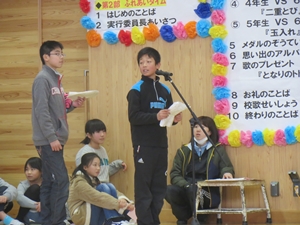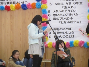 「今日は最高の思い出ができました。ぼくたちが卒業しても、みんなで、稲田小をもっとよりよい学校にするためにがんばってください。ありがとうございました。」