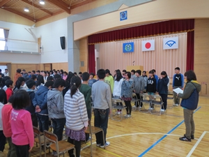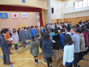 2016年3月7日 15時00分 3月7日(月)、4・5・6年生全員による卒業式全体練習が行われました。1回目となるこの日は、礼法の確認と式歌、「別れの言葉」の練習を中心に行いました。4・5年は、6年生が気持ちよく卒業することができるように、6年生は、卒業生としての勇姿を下級生たちに見せることができるように、全力で練習に取り組んでほしいと思います。