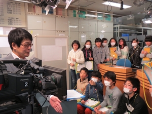 テレビ局では、見学担当の方や今現在アナウンサーとして活躍されている方から、番組が放送されるまでの流れやアナウンサーの仕事内容などを説明していただきました。また、「ゴジてれChu!」の放送が行われるスタジオの中にも入らせていただき、セットや照明などにさまざまな工夫がなされていることを教えていただきました。見学の最後には、アナウンサーの方と一緒に記念写真撮影も行いました。