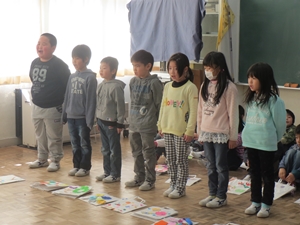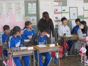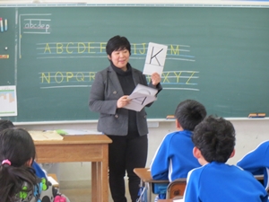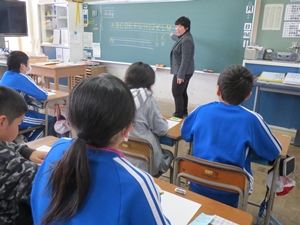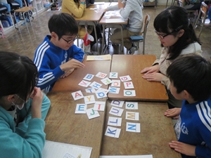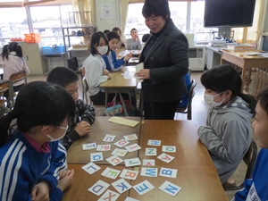 この日は、今年度3回予定している乗り入れ授業の第1回目で、英語での自己紹介の他、アルファベットの大文字を書いたり、言ったりする授業が行われました。子どもたちは、中学校の先生の授業ということで初めは少々緊張していましたが、次第に気持ちも乗ってきて、「アルファベットかるた」などを通して、楽しく学習することができました。