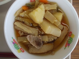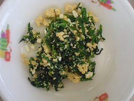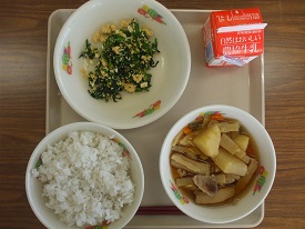2017年6月12日 13時17分 本日の給食のメニューは、「「麦ご飯、ほうれん草の卵チーズ和え、じゃがいものうま煮、ふりかけ」です。ほうれん草のチーズ和えは、毎回お伝えしていますが、私の大好物です。これはうまい。ほうれん草と卵、そしてチーズが三位一体となって絶妙な味わいを生み出しています。自宅でも作ってみたい一品です。うま煮は、豚肉からさつまあげ、たけのこなどじゃがいも以外にもたくさん具が入っています。これもおいしい味付けで最高です。これだけ具だくさんに作るのって、家庭ではなかなか大変ですよね。さすがは給食!本日もおいしくいただきました。ごちそうさまでした。
