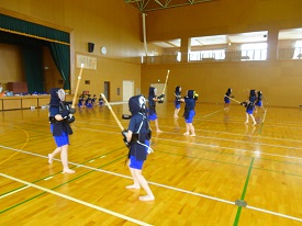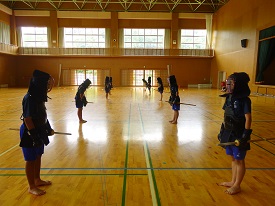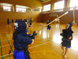 2017年6月19日 11時06分 2年生の保健体育科では、武道の時間に「剣道」を学習しています。面や防具の付け方を学び、試合前と後の礼儀作法、基本的な技を学んだ後、実践形式で試合を行っています。まだまだ声が出ませんが、容姿は立派な剣士です。これからいろいろ学んでください。がんばれ、岩中剣士たち。
