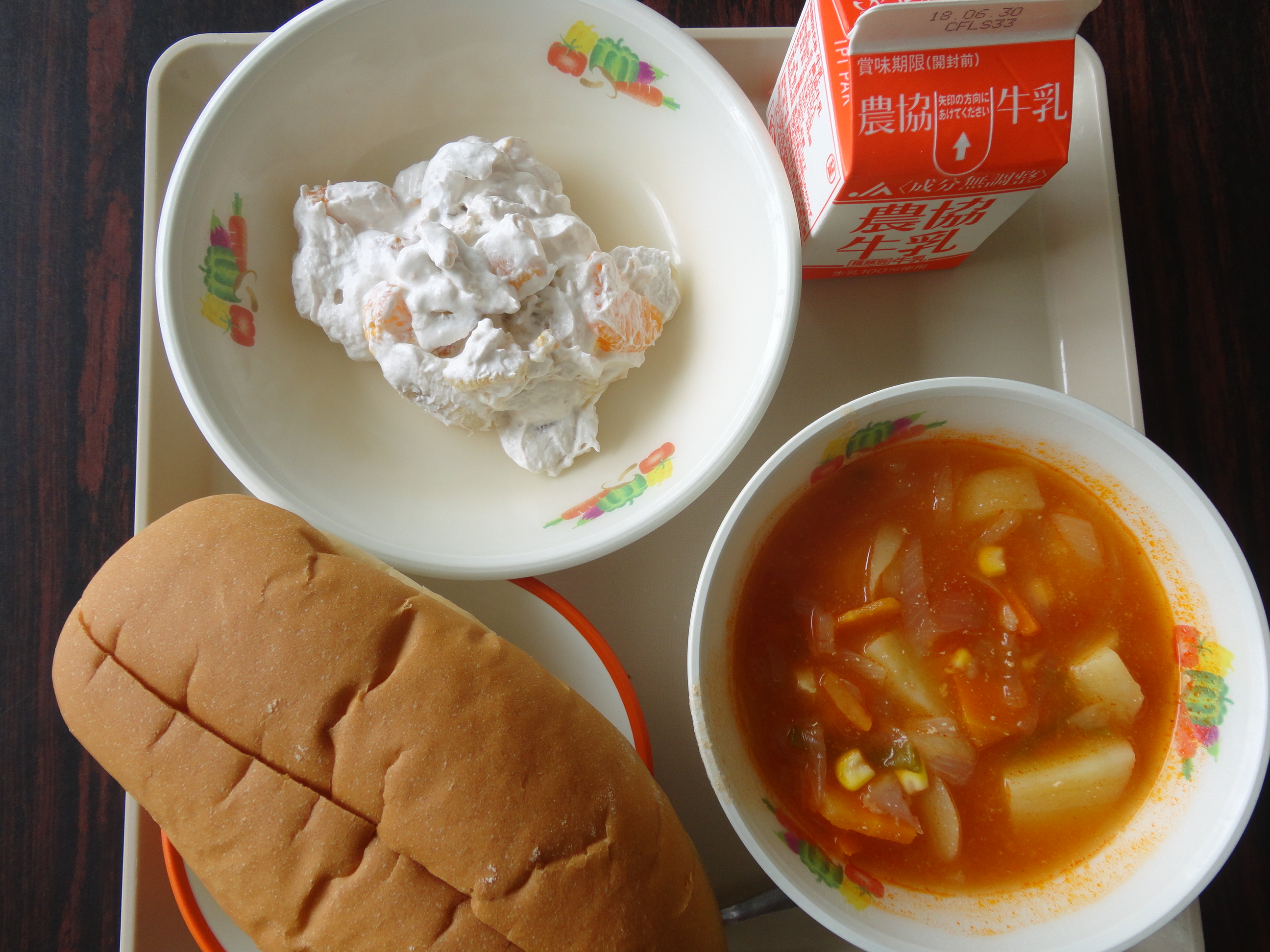 2018年6月21日 12時49分今日のメニューは、「セルフフルーツサンドパン、牛乳、とり肉のトマトソース煮」です。甘すぎず、パンにあう味付けのフルーツを背割れパンにはさんでいただきました。とり肉のトマトソース煮は食べやすく、たっぷり野菜でおいしくいただきました。ごちそうさまでした。