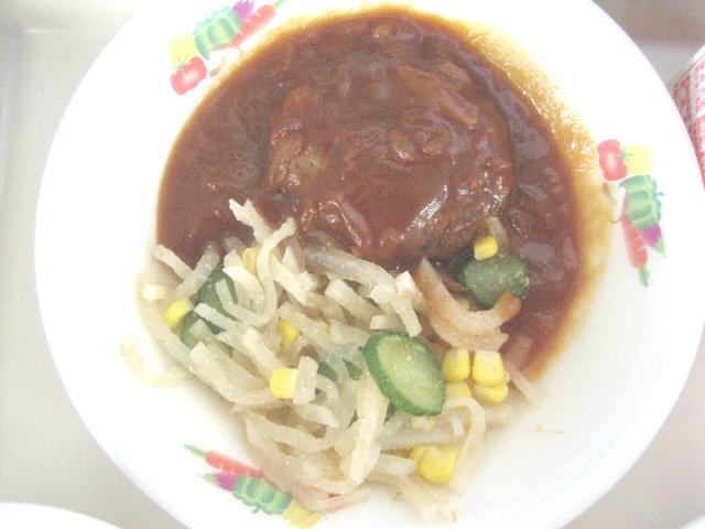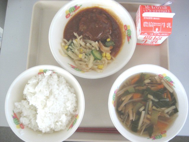 2018年6月29日 13時06分今日のメニューは,ご飯,ハンバーグのケチャップソース,だいこんサラダ,ハムとチンゲン菜のスープです。ハンバーグは柔らかくてとてもジューシー,ケチャップソースをからめるとご飯と相性バッチリ。スープはハムとチンゲン菜がおいしさの主役,さらに椎茸やたけのこなどの脇役もいい味出してる。だいこんサラダはゴマ風味。今日もごちそう様でした。大満足。