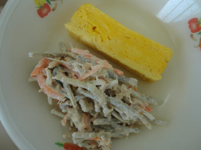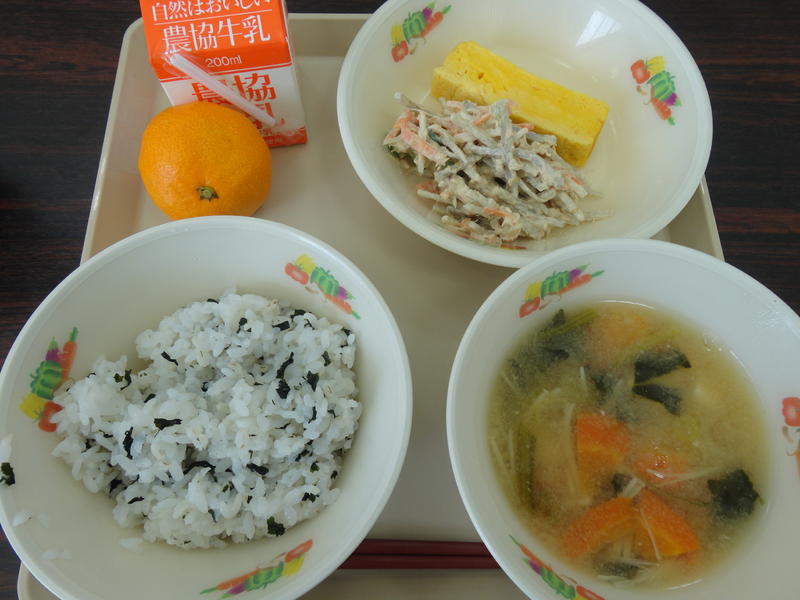 2018年12月12日 12時50分今日のメニューは、「わかめごはん、牛乳、厚焼き卵、ごぼうサラダ、えのき入りみそ汁、みかん」です。わかめの磯の香りが食欲を高めてくれました。甘い厚焼き卵とサラダ、みそ汁とともに大変おいしくいただきました。デザートのみかんもありがたかったです。ごちそうさまでした。