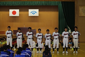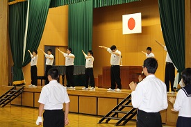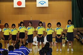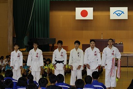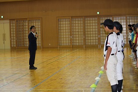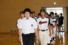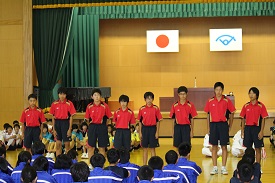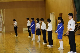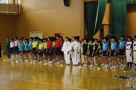 2015年9月25日 21時39分 支部新人戦に向けて選手壮行会が行われました。選手達が堂々と入場し、選手紹介と決意表明を元気よく行いました。今回は、3年生の旧部長が、後輩達のために激励のメッセージを発表しました。とても気持ちのこもった感動的な内容でした(私の目もウルウル・・・)。また、応援団も3年生を中心に素晴らしい応援でした。今日は、1・2年生の壮行会でしたが、3年生の凄さを大いに感じさせるものでした。みんなの熱い思いを胸に、本番では最高の活躍を期待しています。