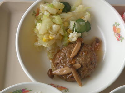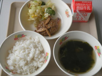 2019年9月5日 09時30分ハンバーグはとってもジューシー,きのこ入り和風ソースがおいしさを引き立てます。キャベツのサラダはシャキシャキ食感が楽しい,塩加減もいい塩梅。スープはわかめタップリ,海の幸を堪能しました。今日もごちそう様でした。大満足。