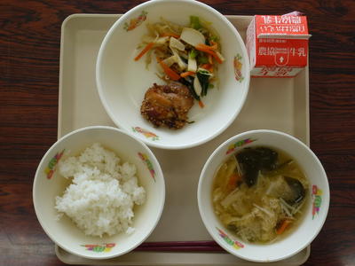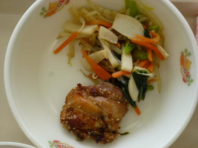 2019年10月11日 12時28分鶏肉の香味焼きはとっても柔らかジューシー,ネギとゴマの香りもよく,ご飯のおかずにぴったり。みそ汁はえのき入り,野菜のうまみとシャキシャキ感を楽しめます。和え物は野菜とかまぼこ,ほんのり辛子でパクパク。今日もごちそう様でした。大満足。