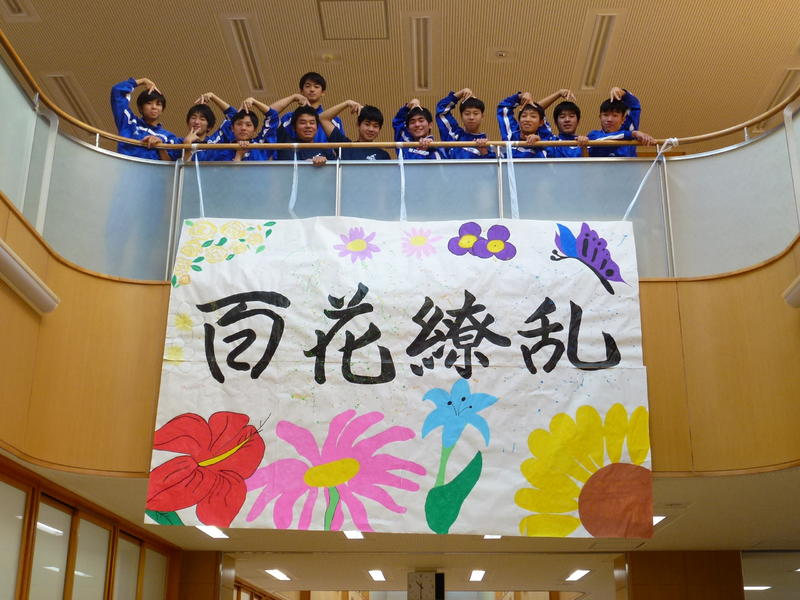 2019年10月16日 12時15分校舎の吹き抜け部分に岩中祭テーマを掲示しました。今年度は「百花繚乱」です。土曜日が本番,盛り上がってきています。