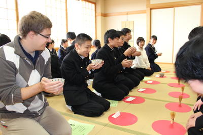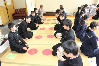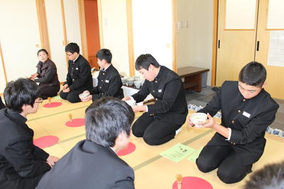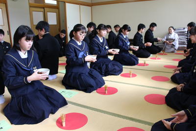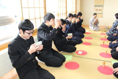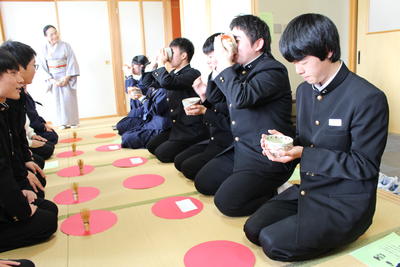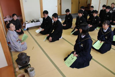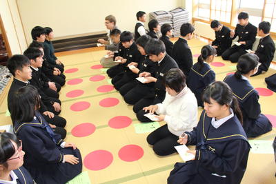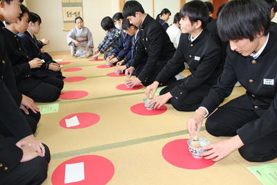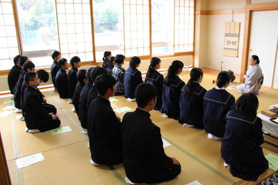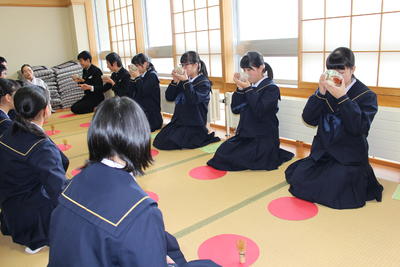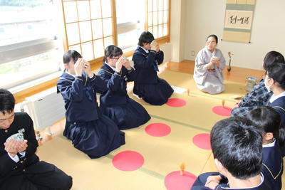 2019年11月20日 15時28分20日(水)に3年生が茶道を体験しました。大日本茶道学会郡山支部の山田仙洋先生と,本校スクールカウンセラー大山和子先生を講師としてお招きし,茶道の基本を教えていただきました。茶道の歴史,お辞儀の仕方,相手への心遣いなどを,お互いにお茶を点て合うことを通して学びました。山田先生,大山先生ありがとうございました。