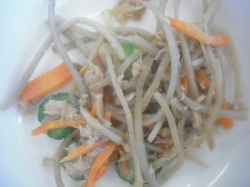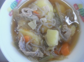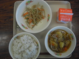 2015年11月4日 13時20分 本日の給食のメニューは、「麦ご飯、肉じゃが、かみかみごぼう和え、味付けのり」です。「かみかみ献立」と題して、よく噛んで食べましょうということです。かみかみごぼう和えは、とにかくごぼうの歯ごたえが最高です。噛めば噛むほど味が出るって感じです。肉じゃがは、よく味がしみていて、おいしいです。じゃがいもたっぷり、肉たっぷりで食べ応え十分です。本日もおいしくいただきました。ごちそうさまでした。