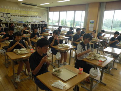 2020年9月1日 13時15分今日のメニューは、豚肉のスタミナ焼き・ごはん・わかめと豆腐のみそ汁・牛乳でした。テストも残り1教科です。しっかりと食べて頭の働きを良くして、午後の教科に臨んでくださいね。また、今日から部活動が再開です、放課後の練習に向けても食は大事ですので。テストの合間ではありましたが、食べている姿は何となくほっとした様子でした。今日は3年1組を訪問しました。