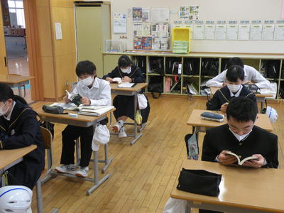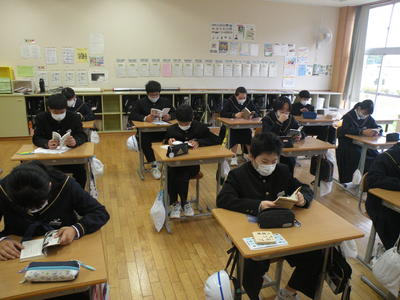 2020年10月16日 09時00分3年生の保護者の皆様におかれましては、事前に配付しました「お知らせ」や「学校だより・学年だより」に記載してあります注意事項を再度、ご覧いただきご入場をお願いします。また、当日は「リボンを付ける」「来場者票の提出」をお願いします。なお、県内においては、毎日のように新型コロナウイルス感染拡大の状況にあります。当日体調のわるい方や発熱のある方はご入場をお控えください。もしも、ご家族が保健所から濃厚接触者に指定された場合は、お子さまの登校の判断については、すぐに学校までご連絡をお願いします。今日の一言です。写真は1年1組、2組の朝自習の様子です。