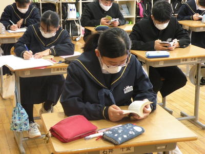2020年12月14日 08時30分昨日の朝刊にも掲載されていましたが、本校の3年生女子生徒とお父さんの作品が「絆部門」で優秀賞に輝きました。併せて、学校賞も受賞することとなりました。本校での表彰式には、福島県教育庁県中教育事務所長がお見えになり、今週の水曜日16日に校長室で行われます。その様子につきましては、ホームページや学校だよりでご報告させていただきます。受賞、おめでとうございます。今日は3年1組、2組を訪問しました。みんな一生懸命に朝自習に取り組んでいました。写真の女子生徒が優秀賞に輝いた生徒です。養護教諭の今日のひと言です。