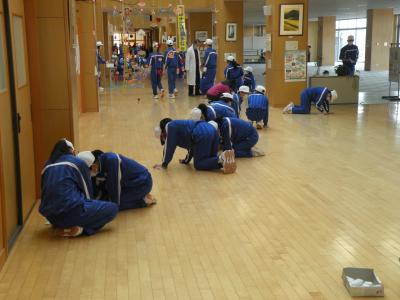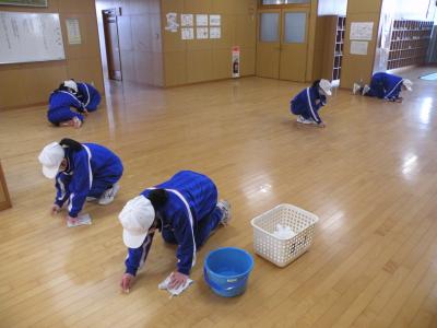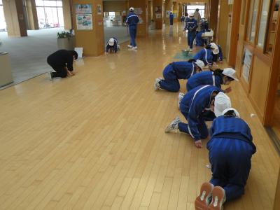 全校生徒で「1F廊下の水拭き作業」を行いました。