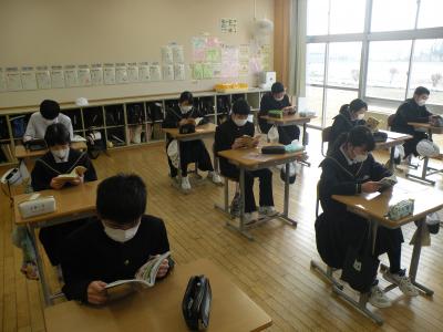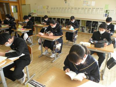 2021年3月5日 08時20分今日は県立高校前期選抜試験の最終日です。8名の生徒が面接試験に挑みます。平常心で頑張ってくださいね!今朝は爽やかな日差しの中、自転車通学してくる生徒が多く見られました。久しぶりに自転車で通学した3年生も数名いました。1年1組、2組の朝自習の様子です。きちんとした取り組みができていました。養護教諭からの今日のひと言です。今日は金曜日です。1週間のまとめをしっかりとしてください。廊下もたいへんにきれいになりました。今日はワックスがけです。