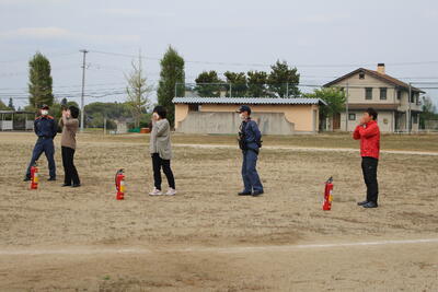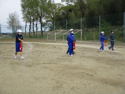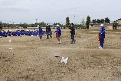 その後、各クラスの代表生徒と代表教師が、訓練用の水消化器で消火訓練を行いました。