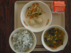 本日の給食のメニューは、「かおりご飯、小籠包、ナムル、五目スープ」です。小籠包は、ちょうど良い味付けでおいしかったです。できた