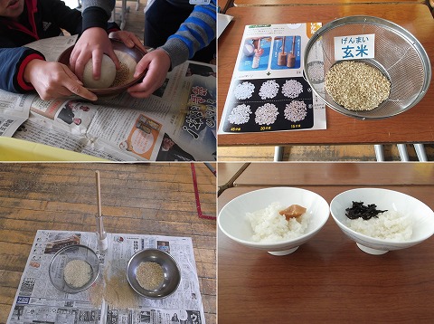 2014年11月18日 11時37分 種もみから育てたなかよし学級のバケツ苗。10月に収穫し、脱穀・もみすり・精米の過程を経て白いお米になりました。脱穀は鉛筆や割り箸を使って、もみすりはすり鉢とソフトボールで、精米は瓶と棒で手作業にチャレンジしました。どれも根気のいる作業でした。途中から使った精米器の仕事ぶりに「うわぁ速い!」「白いお米になった!」とこどもたちも大喜び。