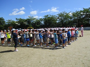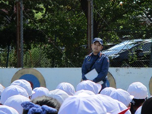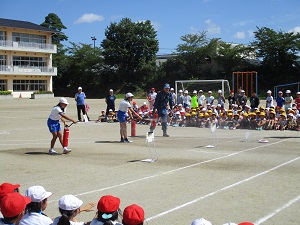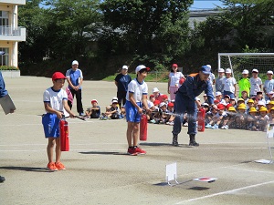 校庭に避難した後、消防署員さんから消火器の使い方を教えていただきました。