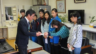 2014年11月12日 16時15分 柏城小では、福祉委員会の児童が中心となってプルタブを集め、その収益を様々な団体に寄付をしています。今日、須賀川市の社会福祉協議会とユネスコ協会の役員の方に来校していただき、「歳末助け合い」と「ユネスコ寺子屋」の募金として全校生が集めたプルタブの収益金の一部を善意の形として手渡しました。