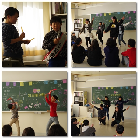 クラスが紅白に分かれて、歌やダンスを披露し合いました。