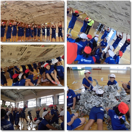 はじめに、たくさんの新聞紙をのりで貼り合わせた大きな紙で遊びました。