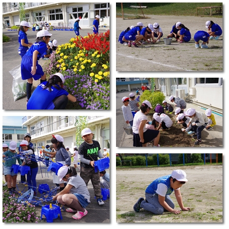 校庭の除草や花壇の手入れ、植木鉢の片付けなど
