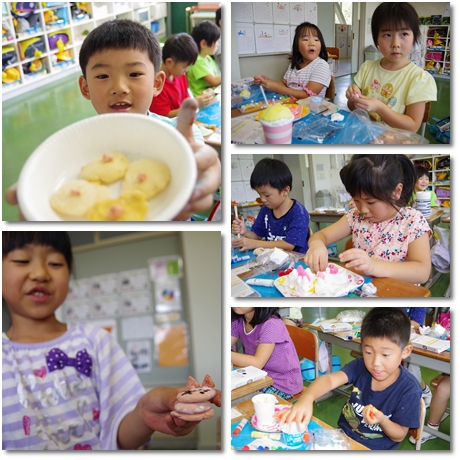 紙粘土に色をつけながらお寿司や唐揚げ、
