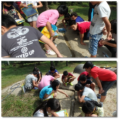 5年生は理科の時間に校庭のすみの丘に川をつくり、