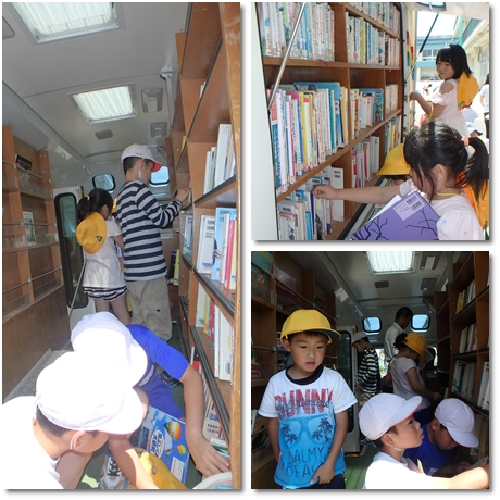 休み時間に学校に着いた移動図書館車にたくさんの児童が集まっていました。