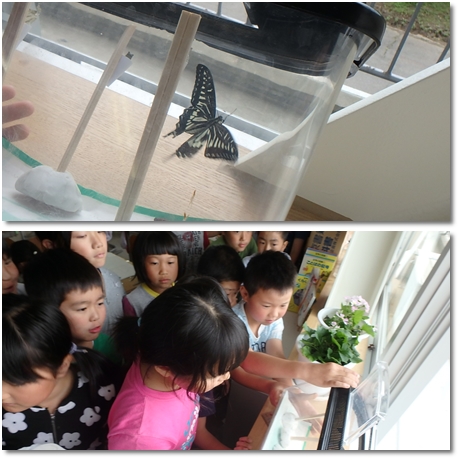 休み時間に虫かごのふたを開け、窓の外に放ちました。