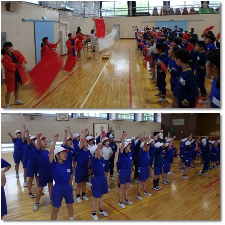 前半、天気が悪かったので、体育館で開会式の練習をしました。