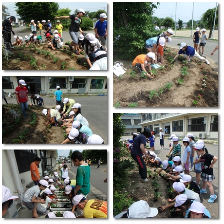 長小タイムの時間に全校で花壇の花苗植えを行いました。