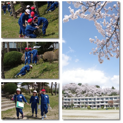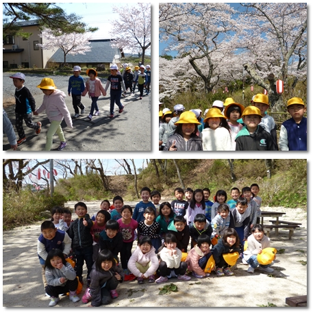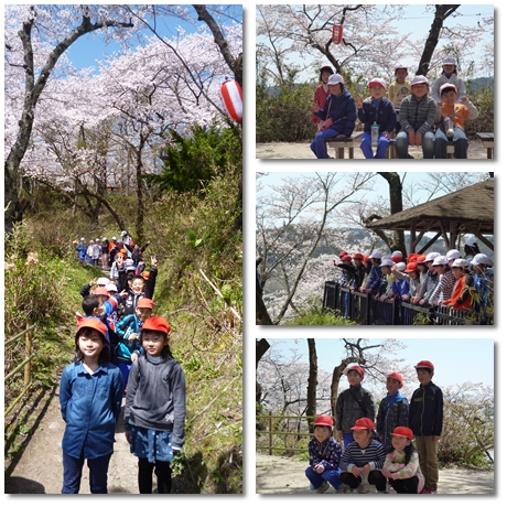 2年生が1年生と手をつないで城山に登り、お花見会をしました。