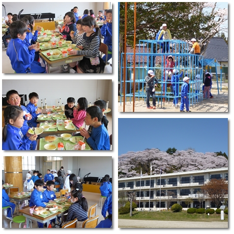 城山でのお花見を終え、3年生はオープンスペースで一緒に給食を食べました。