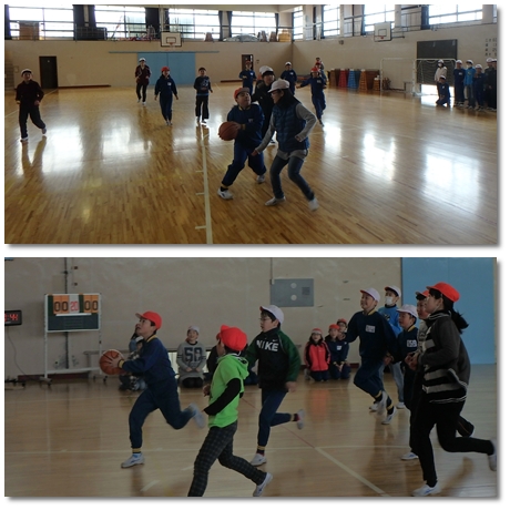 4・5・6年生がミックスのチームでバスケットボールのゲームをしました。