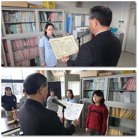 また、福島県書き初めコンクール、ユネスコ平和作文コンクール、子どもの災害事故防止書写コンクールなどで優秀な成績をおさめた児童に賞状が授与されました。