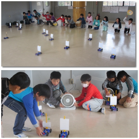 3年生は理科の学習で風の力で走る自動車を作りました。