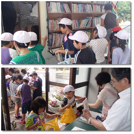 たくさんの児童が移動図書館車の本に手を伸ばし、