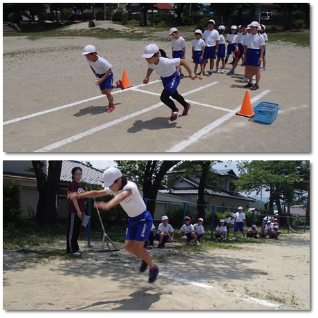 今日は4~6年生が、50m走やソフトボール投げ、立ち幅跳びなどの記録をとりました。