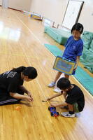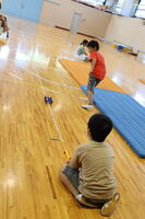 自分たちで組み立てた車を、ゴムの力を使って遠くまで走らせました!