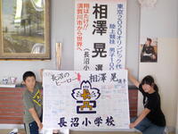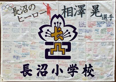 しかし,すばらしい出来栄えです。長沼小学校全員の思いが詰まったスペシャルな応援旗。1年生も丁寧に思いを込めて書きました。相澤選手を応援する熱い想いは,全員一緒です。少しでも相澤選手の力になれると嬉しいです。ちなみに旗上部の応援ロゴは,チーム長沼の美術担当〇〇が気合を入れて描きました。こちらも頑張っていましたよ。