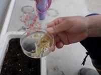 ラベルを作り,5年生一人一人が自分の種が発芽するように準備を進めていました。