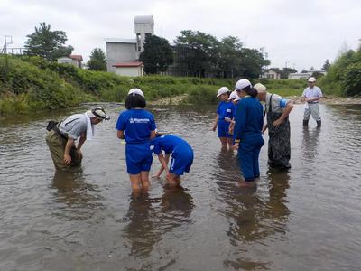子どもたちは、水の中の石の様子や生き物の様子を見入っていました。