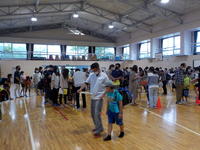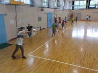 写真は,体育館での 3・4年生の投げ投げタイムです。