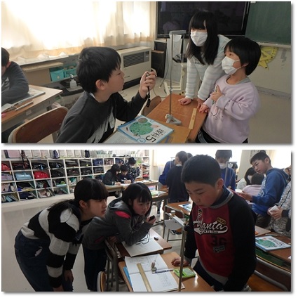 5年生は理科の時間に、振り子の1往復する時間について実験して調べました。